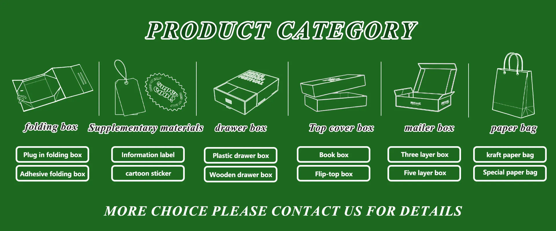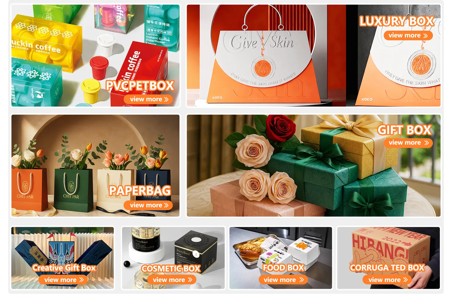 Productos principales:Cajas de papel, bolsa de papel, etiqueta, caja de regalo de embalaje, Impresión manual del usuario